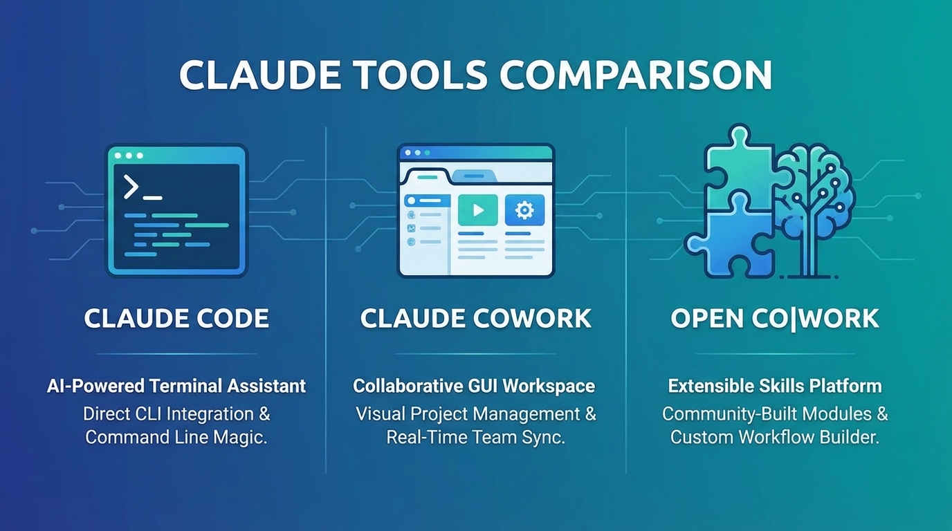 Interface: Claude Code is terminal-based CLI. Claude Cowork and open co|work both offer GUI interfaces.